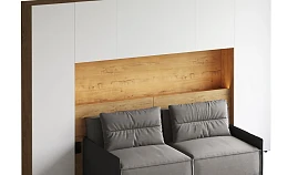 Кроватный блок предназначен для использования совместно с кроватью или диваном. Блок имеет два отделения за откидными дверьми и открытую полку над ними. Двери открываются за кромку, с помощью газовых кронштейнов. Кроватный блок оснащен светодиодным светильником, расположенным на открытой верхней полке. Светильник представляет собой алюминиевый профиль с матовым экраном, внутри которого установлена светодиодная лента. С левой и с правой стороны переднего щита блока установлены выключатели светильника и эл. розетки с разъемами USB А и Type C. Блок установлен на регулируемые опоры.