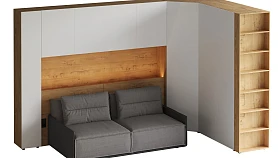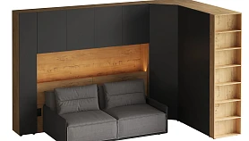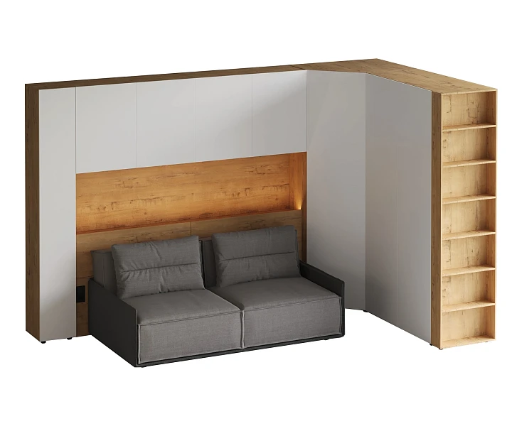 Линейка корпусной мебели, которая закрывает большинство потребностей по хранению и организации вещей. Универсальные и функциональные шкафы, тумбы, стеллажи, столы группируются по функциональны зонам. С их помощью можно обустроить прихожую, гостиную, кабинет, спальню, детскую. В основе дизайна — софт-минимализм с продуманными деталями и материалами. Скрытые механизмы открытия дверей, естественная древесная текстура, большая вместительность, белый цвет делают их исключительно удачными для большинства современных пространств. Гладкие фасады без декора и ручек поддерживают идею отказа от визуального шума, двери открываются по принципу «нажал-открыл». Мебель Modus создает уравновешенный интерьер с выразительными компонентами, настраивающими на ритмичный образ жизни, целеустремленность и чувство свободы от избыточных деталей. Кроватный блок предназначен для использования совместно с кроватью или диваном. Блок имеет два отделения за откидными дверьми и открытую полку над ними. Двери открываются за кромку, с помощью газовых кронштейнов. Кроватный блок оснащен светодиодным светильником, расположенным на открытой верхней полке. Светильник представляет собой алюминиевый профиль с матовым экраном, внутри которого установлена светодиодная лента. С левой и с правой стороны переднего щита блока установлены выключатели светильника и эл. розетки с разъемами USB А и Type C. Блок установлен на регулируемые опоры. Внутренние размеры отделений для хранения: 1160х850х260мм каждое отделение. Максимальная нагрузка на верхнюю полку не должна превышать 20 кг. Панель представляет собой щит из ЛДСП 16 мм. предназначенный для установки над кроватным блоком. Панель навешивается на регулируемые подвесы. Шкаф имеет три регулируемых подвеса для навешивания на стену. Полки имеют возможность перестановки по высоте в трех уровнях. Дверь открывается по принципу «нажал-открыл». Максимальная нагрузка на каждую полку не должна превышать 7 кг. Пенал Modus состоит из корпуса и фасада. Корпус с проходным нижним и верхним щитом установлен на опоры. Опоры регулируемые, пластик черный, круглые. Корпус горизонтальной стенкой разделен на два отделения по высоте. Верхнее отделение оснащено одной съёмной полкой, нижнее – пятью съёмными полками. Полки 6 – съемные, с перестановкой по высоте в 3 положения. Максимальная нагрузка на одну полку не должна превышать 4кг. Фасад представляет собой распашную дверь, которая открывается по принципу «нажал-открыл». Установка двери возможна с открыванием как в левую, так и в правую сторону. Диван входит в стоимость.
