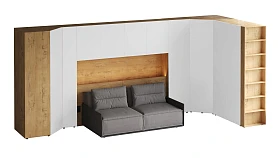 Линейка корпусной мебели, которая закрывает большинство потребностей по хранению и организации вещей. Универсальные и функциональные шкафы, тумбы, стеллажи, столы группируются по функциональны зонам. С их помощью можно обустроить прихожую, гостиную, кабинет, спальню, детскую. В основе дизайна — софт-минимализм с продуманными деталями и материалами. Скрытые механизмы открытия дверей, естественная древесная текстура, большая вместительность, белый цвет делают их исключительно удачными для большинства современных пространств. Гладкие фасады без декора и ручек поддерживают идею отказа от визуального шума, двери открываются по принципу «нажал-открыл». Мебель Modus создает уравновешенный интерьер с выразительными компонентами, настраивающими на ритмичный образ жизни, целеустремленность и чувство свободы от избыточных деталей. Кроватный блок предназначен для использования совместно с кроватью или диваном. Блок имеет два отделения за откидными дверьми и открытую полку над ними. Двери открываются за кромку, с помощью газовых кронштейнов. Кроватный блок оснащен светодиодным светильником, расположенным на открытой верхней полке. Светильник представляет собой алюминиевый профиль с матовым экраном, внутри которого установлена светодиодная лента. С левой и с правой стороны переднего щита блока установлены выключатели светильника и эл. розетки с разъемами USB А и Type C. Блок установлен на регулируемые опоры. Внутренние размеры отделений для хранения: 1160х850х260мм каждое отделение. Максимальная нагрузка на верхнюю полку не должна превышать 20 кг. Панель представляет собой щит из ЛДСП 16 мм. предназначенный для установки над кроватным блоком. Панель навешивается на регулируемые подвесы. Шкаф имеет три регулируемых подвеса для навешивания на стену. Полки имеют возможность перестановки по высоте в трех уровнях. Дверь открывается по принципу «нажал-открыл». Максимальная нагрузка на каждую полку не должна превышать 7 кг. Пенал Modus состоит из корпуса и фасада. Корпус с проходным нижним и верхним щитом установлен на опоры. Опоры регулируемые, пластик черный, круглые. Корпус горизонтальной стенкой разделен на два отделения по высоте. Верхнее отделение оснащено одной съёмной полкой, нижнее – пятью съёмными полками. Полки 6 – съемные, с перестановкой по высоте в 3 положения. Максимальная нагрузка на одну полку не должна превышать 4кг. Фасад представляет собой распашную дверь, которая открывается по принципу «нажал-открыл». Установка двери возможна с открыванием как в левую, так и в правую сторону. Диван входит в стоимость.
