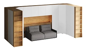 Кроватный блок предназначен для использования совместно с кроватью или диваном. Блок имеет два отделения за откидными дверьми и открытую полку над ними. Двери открываются за кромку, с помощью газовых кронштейнов. Кроватный блок оснащен светодиодным светильником, расположенным на открытой верхней полке. Светильник представляет собой алюминиевый профиль с матовым экраном, внутри которого установлена светодиодная лента. С левой и с правой стороны переднего щита блока установлены выключатели светильника и эл. розетки с разъемами USB А и Type C. Блок установлен на регулируемые опоры.