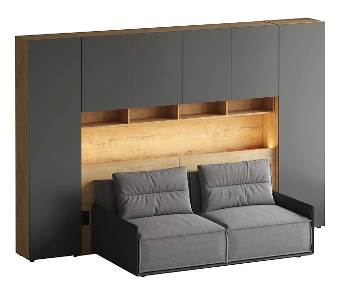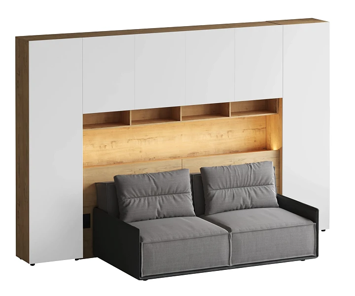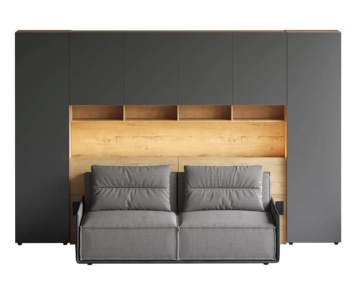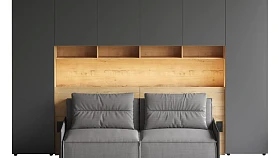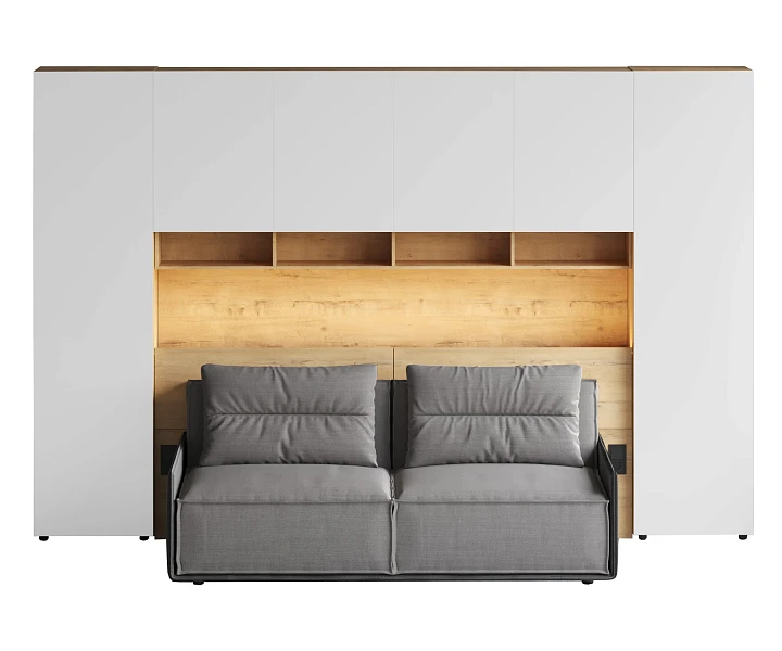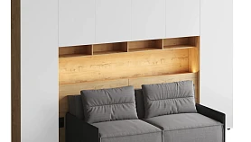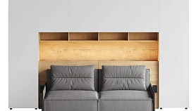 Линейка корпусной мебели, которая закрывает большинство потребностей по хранению и организации вещей. Универсальные и функциональные шкафы, тумбы, стеллажи, столы группируются по функциональны зонам. С их помощью можно обустроить прихожую, гостиную, кабинет, спальню, детскую. В основе дизайна — софт-минимализм с продуманными деталями и материалами. Скрытые механизмы открытия дверей, естественная древесная текстура, большая вместительность, белый цвет делают их исключительно удачными для большинства современных пространств. Гладкие фасады без декора и ручек поддерживают идею отказа от визуального шума, двери открываются по принципу «нажал-открыл». Мебель Modus создает уравновешенный интерьер с выразительными компонентами, настраивающими на ритмичный образ жизни, целеустремленность и чувство свободы от избыточных деталей. Кроватный блок предназначен для использования совместно с кроватью или диваном. Блок имеет два отделения за откидными дверьми и открытую полку над ними. Двери открываются за кромку, с помощью газовых кронштейнов. Кроватный блок оснащен светодиодным светильником, расположенным на открытой верхней полке. Светильник представляет собой алюминиевый профиль с матовым экраном, внутри которого установлена светодиодная лента. С левой и с правой стороны переднего щита блока установлены выключатели светильника и эл. розетки с разъемами USB А и Type C. Блок установлен на регулируемые опоры. Внутренние размеры отделений для хранения: 1160х850х260мм каждое отделение. Максимальная нагрузка на верхнюю полку не должна превышать 20 кг. Панель представляет собой щит из ЛДСП 16 мм. предназначенный для установки над кроватным блоком. Панель навешивается на регулируемые подвесы. Шкаф имеет три регулируемых подвеса для навешивания на стену. Полки имеют возможность перестановки по высоте в трех уровнях. Дверь открывается по принципу «нажал-открыл». Максимальная нагрузка на каждую полку не должна превышать 7 кг. Диван входит в стоимость.