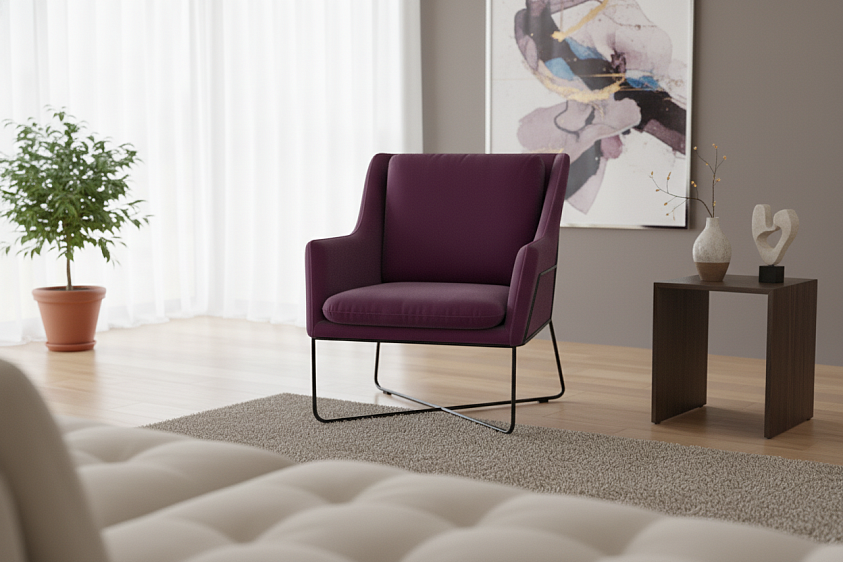 Легкая, компактная, эргономичная мебель Comfort украсит интерьер в стиле лофт, хай-тек, фьюжн, минимализм. Велюровая обивка сложного фиолетового оттенка станет оригинальным акцентом в светлой гостиной, оттенит темные стены в помещении industrial. Главная изюминка модели — скрещенные металлические опоры, которые великолепно гармонируют с простыми формами и лаконичной отделкой.