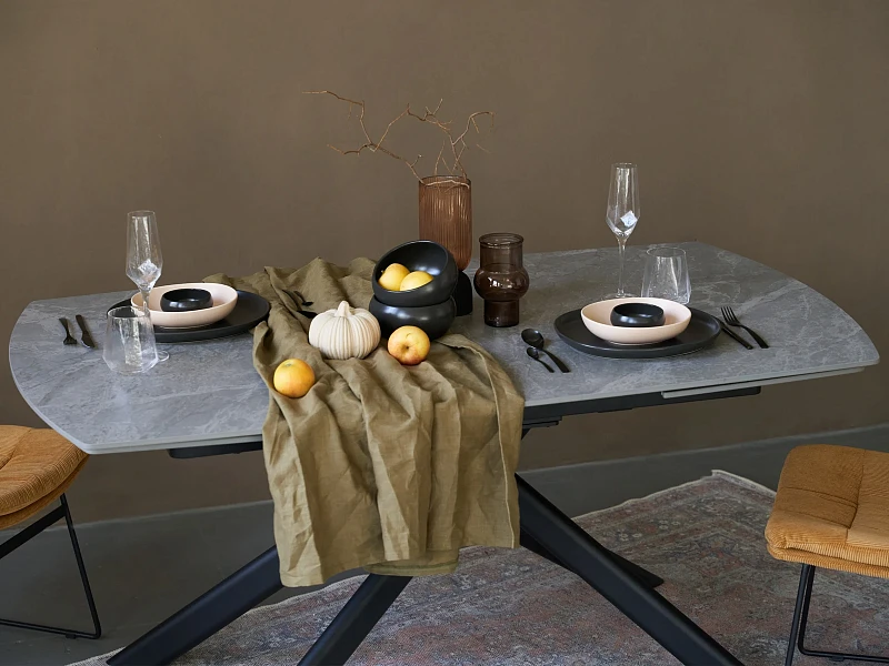 Обеденный раскладной стол с лаконичным характером для стильных интерьеров. Броский внешний вид смягчается плавными линиями и сбалансированными пропорциями. Четыре стальные опоры поддерживают столешницу арочной формы из керамики. Которая отличается прочностью, долговечностью и привлекательной текстурой, напоминающей натуральный камень. Минималистичная геометрия позволяет грамотно вписать предмет практически в любое пространство. Стол гармонично будет смотреться и в квартире, и в загородном доме.