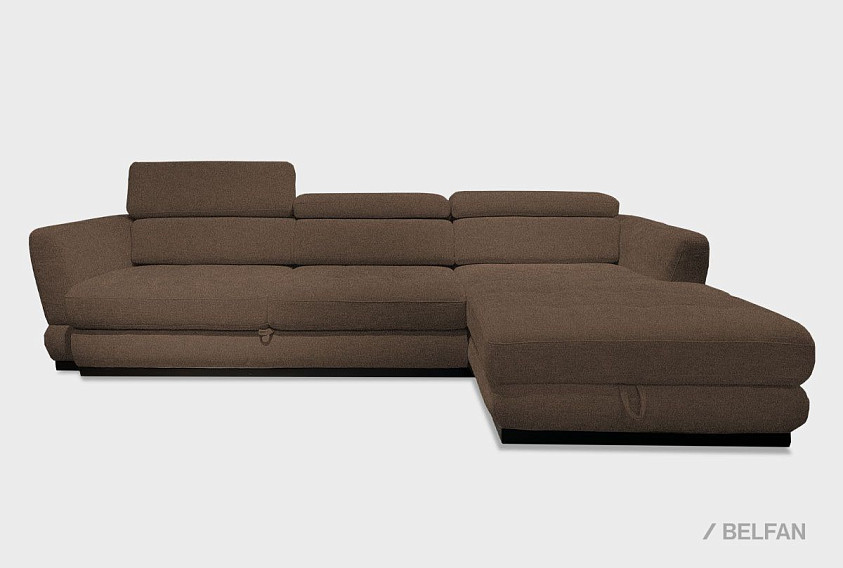 ? С помощью скрытого ремня диван выдвигается вперед до полного раскладывания – передняя часть тянет за собой все остальные части и ставятся на выезжающие ножки.