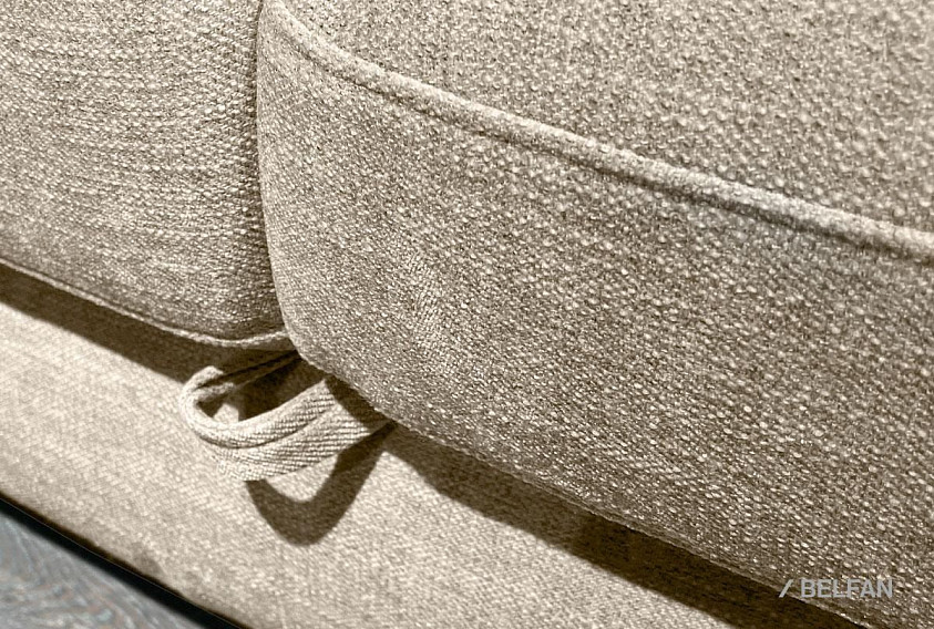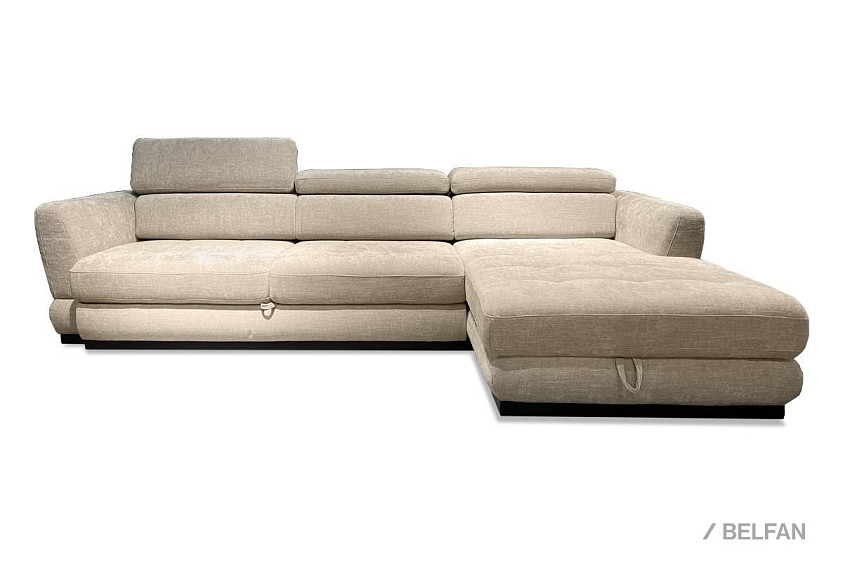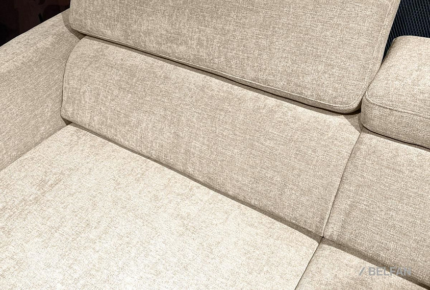 ? С помощью скрытого ремня диван выдвигается вперед до полного раскладывания – передняя часть тянет за собой все остальные части и ставятся на выезжающие ножки.