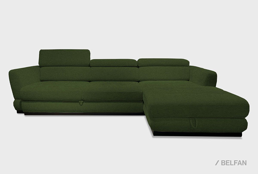 ? С помощью скрытого ремня диван выдвигается вперед до полного раскладывания – передняя часть тянет за собой все остальные части и ставятся на выезжающие ножки.