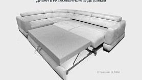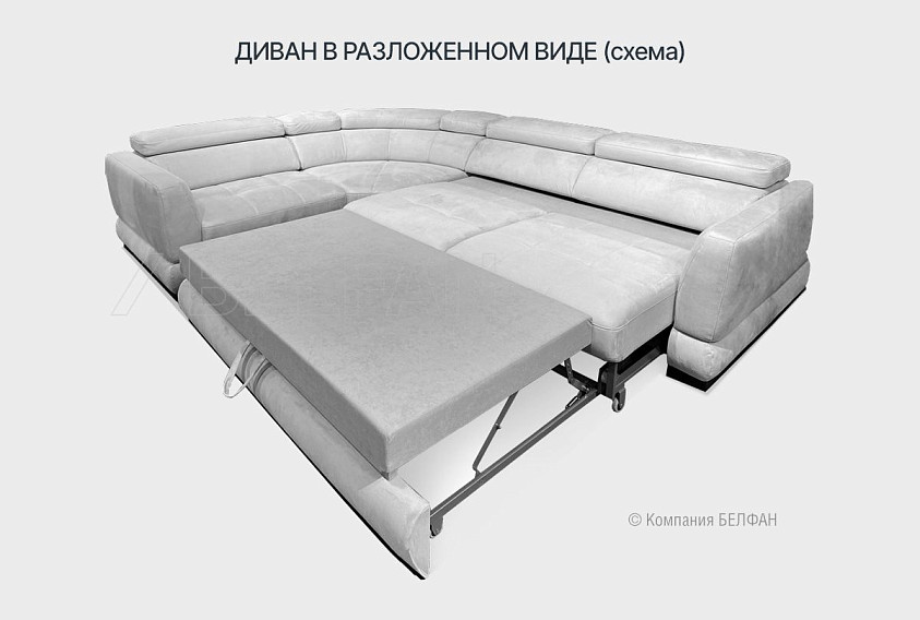 ? С помощью скрытого ремня диван выдвигается вперед до полного раскладывания – передняя часть тянет за собой все остальные части и ставятся на выезжающие ножки.
