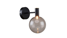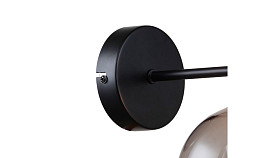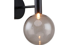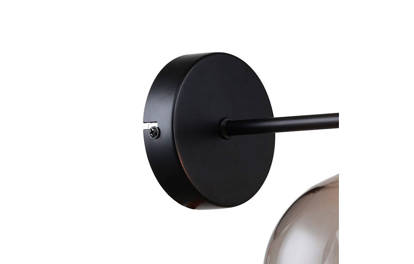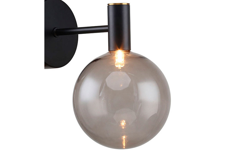 Особенность: каркас черного цвета, с тонкими полосками цвета латуни, которые находятся в середине каркаса, в конце и в основании плафонов, выдувной плафон серого цвета;