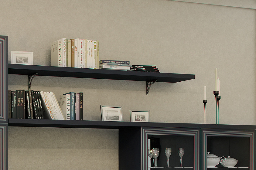 - Полка АГ-026.03 в композициях гостиной устанавливается по общему принципу: с одной стороны она укладывается на крышки модулей АГ-260.01 или АГ-260.02, с другой — может соединяться как с навесными модулями АГ-418.03 и АГ-418.04, так и с напольными шкафами АГ-224.13 и АГ-224.20.