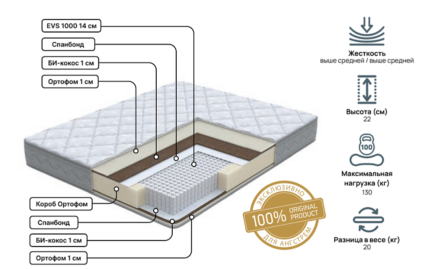 Матрас двухсторонний. Жесткость: выше средней с обеих сторон. В основе матраса 1000 независимых пружин на спальное место, точечно распределяющих нагрузку, обеспечивая комфортным и качественным сном. В составе комфортных слоев Ортофом в сочетании с Би-кокосом. Защитным слоем при их взаимодействии с независимыми пружинами служит спандбонд. По периметру матраса — усиленный короб, благодаря которому матрас обеспечивает необходимую поддержку при сидении. Чехол матраса выполнен из трикотажной ткани, простеганный на дополнительном слое Ортофом. Гарантия фабрики-производителя составляет 18 месяцев.
