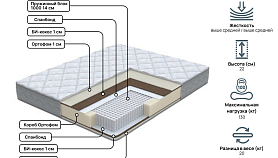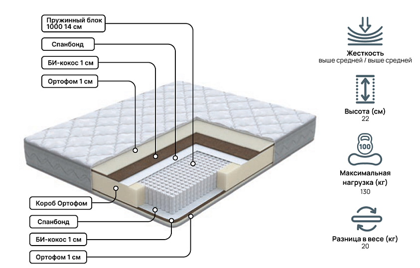 Матрас двухсторонний. Жесткость: выше средней с обеих сторон. В основе матраса 1000 независимых пружин на спальное место, точечно распределяющих нагрузку, обеспечивая комфортным и качественным сном. В составе комфортных слоев Ортофом в сочетании с Би-кокосом. Защитным слоем при их взаимодействии с независимыми пружинами служит спандбонд. По периметру матраса — усиленный короб, благодаря которому матрас обеспечивает необходимую поддержку при сидении. Чехол матраса выполнен из трикотажной ткани, простеганный на дополнительном слое Ортофом. Гарантия фабрики-производителя составляет 18 месяцев.