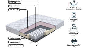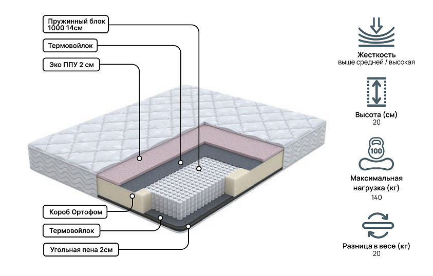 Двусторонний матрас, с высокой жесткостью с одной стороны и выше средней с другой. В основе матраса интеллектуальный блок из 1000 независимых пружин на спальное место. В составе комфортных слоев Эко ППУ и угольная пена, которая обладает антистатическим действием, препятствует появлению микроорганизмов. Чехол матраса выполнен из трикотажной ткани, простеганный на дополнительном слое Ортофом.