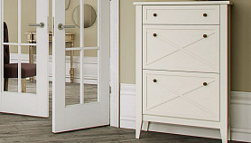 Крышка банкетки — откидная, с мягким элементом. Буковые опоры покрыты эмалью в цвет корпуса;