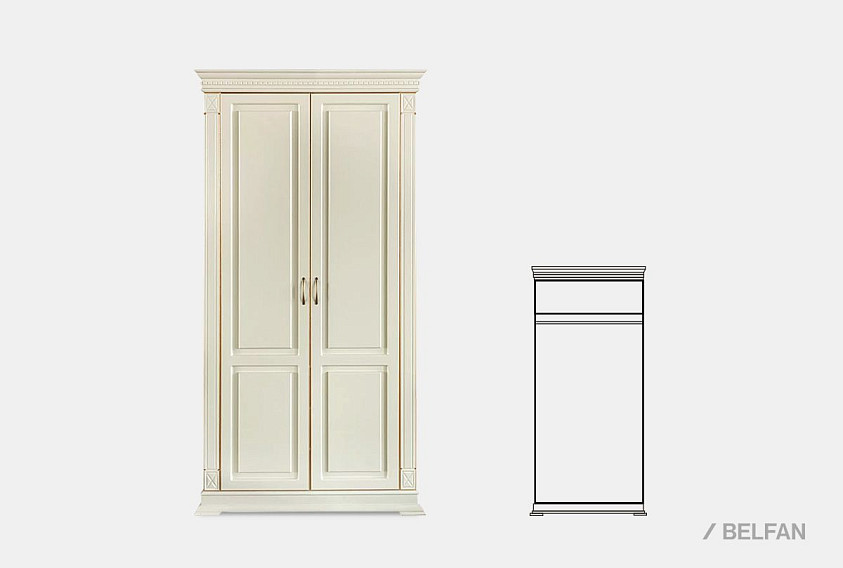 Двухдверный шкаф из коллекции «Верди Люкс» подойдет даже для небольшой квартиры. Он очень вместительный и имеет продуманное функциональное наполнение: штангу для одежды и верхнюю полку. Шкаф подойдет как для гостиной и спальни – в нем Вы сможете хранить личные вещи и постельное белье, так и для прихожей – на его дно можно поставить коробки с обувью, а на верхней полке хранить головные уборы.