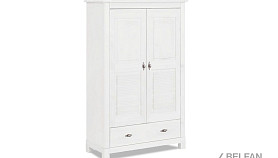 Двухдверный шкаф «Рауна» 21 с ящиками для вещей. Две двери, один ящик из массива сосны для спальни. За двумя распашными дверцами расположены две регулируемые по высоте полки для хранения одежды. Внизу расположен большой выдвижной ящик на роликовых направляющих. Ширина шкафа 97 см, высота 150 см, глубина 42 см.