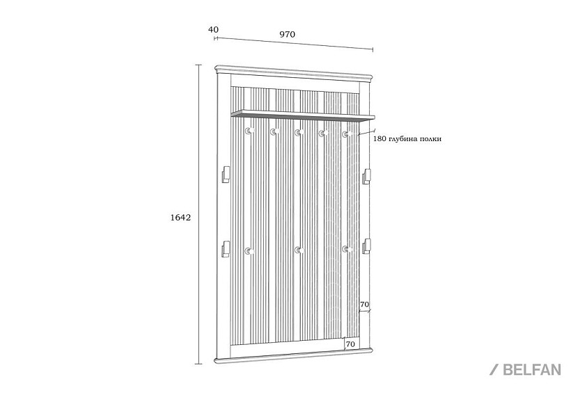 Вешалка настенная «Рандеву» 160. Размеры (ШxВxГ) 970 x 1642 x 40 мм. Классическая настенная вешалка из коллекции «Рандеву» - практичное приобретение для небольшой прихожей. Оснащена восемью крепкими крючками и зеркалом. Может использоваться в комплекте с другими подходящими по стилю предметами мебели или как отдельный элемент.