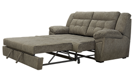 - Для раскладывания необходимо потянуть за середину передней панели и выкатить ножную секцию до упора, при этом будут выдвигаться средняя и главная секции. Затем нужно поднять блок мягкого элемента ножной секции и установить его на переднюю панель;