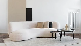 Диван и кресло оригинальной формы выполнены в минималистичном стиле. У мягкой мебели отсутствуют подлокотники, сиденье и спинка напоминают волну. Необычный дизайн сочетается с продуманной эргономичностью, комфортом при сидении и качественными материалами.