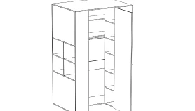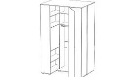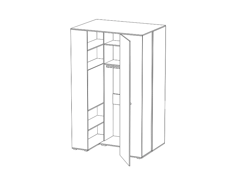 Шкаф-гардероб представляет собой многоцелевой шкаф для хранения одежды, обуви, книг, аксессуаров и других вещей. С торца шкафа есть открытое отделение с полками. В нижней части находится панель для примыкания кровати или стола. Во внутреннем отделении шкафа располагаются отделения с полками и штанга. Шкаф может быть выполнен как в левом, так и в правом исполнении. Предусмотрена комбинация с навесными шкафами и полками с торца шкафа. Шкаф оснащен светодиодным светильником с датчиком движения.