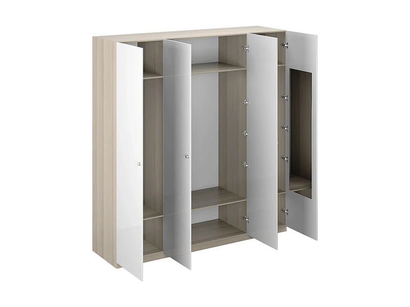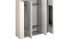 Шкаф четырехдверный состоит их трёх отделений.|В отделениях расположены верхние стационарные и нижние съемными полки.|На одной дверце шкафа с внутренней стороны расположено зеркало.|Шкаф установлен на регулируемые опоры.|Данную мебель рекомендуется крепить к стене.|Ручки и внутренние элементы продаются отдельно.