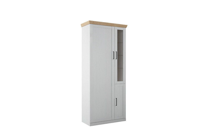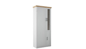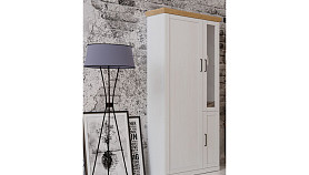 Шкаф трехдверный, с вертикальной перегородкой, разделяющей шкаф на два отделения (одно - под одежду с выдвижной штангой и полками, другое — с полками ЛДСП и стеклополками);