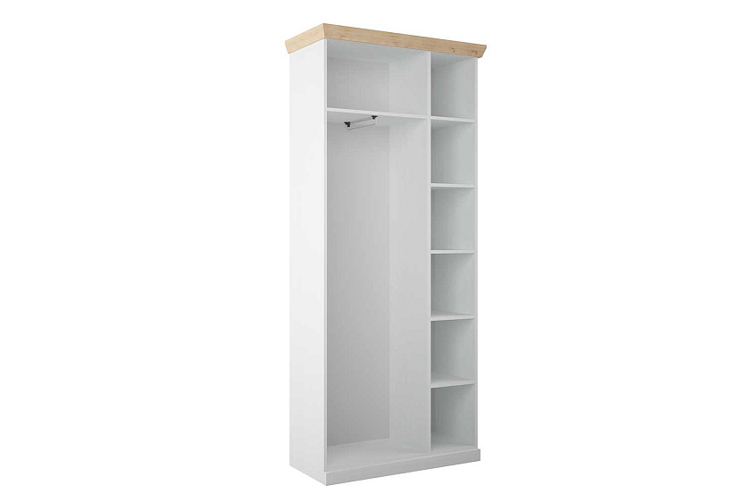 Отделения шкафа при сборке можно менять местами (собрать в левостороннем исполнении — отделение с выдвижной вешалкой слева и правостороннем варианте — отделение с выдвижной штангой справа);