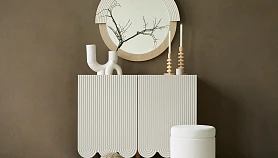 Mira — коллекция выразительных сервантов, особенностью которых являются фактурные фасады с волнообразной обработкой нижнего края. Дизайн привлекает внимание. Рифлёная поверхность распашных дверей придаёт динамики и разнообразия.