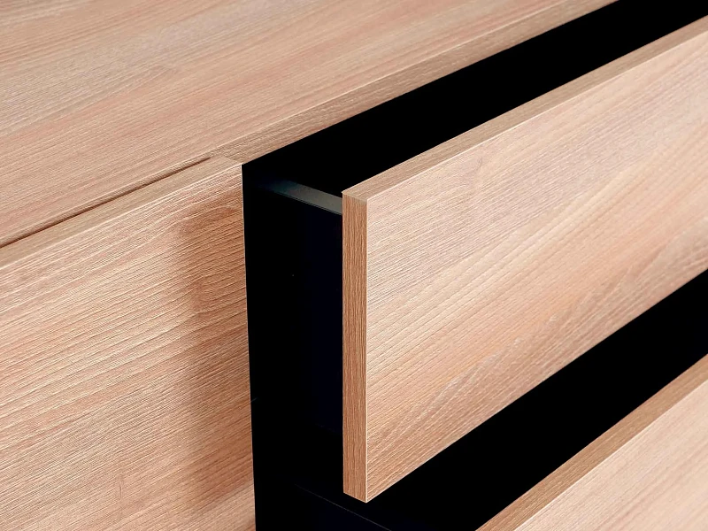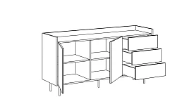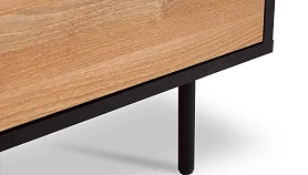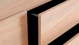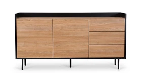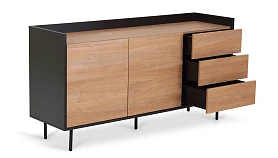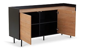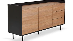 Особенность линейки заключается в контрасте элементов. Скругленные изящные металлические ножки поддерживают внушительное основание. При этом внешний вид моделей остается лёгким и элегантным. Также игру противоположностей усиливают древесная текстура на фасадах и черный цвет боковин с задней стенкой. Что придаёт большей динамики и выразительности дизайну. Эксклюзивность и завершенный вид воссоздает рамка, возвышающаяся над верхним горизонтом. Минималистичный вид конструкциям обеспечивает скрытая фурнитура. Двери и ящики открываются плавно, без шума и усилий. Комбинируйте комоды и серванты Look для создания целостного образа интерьера.