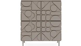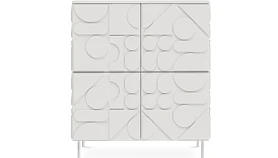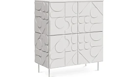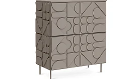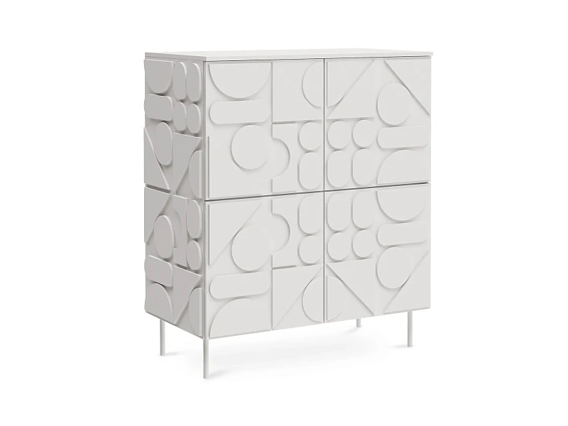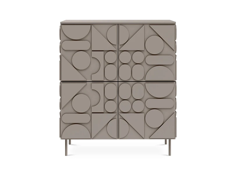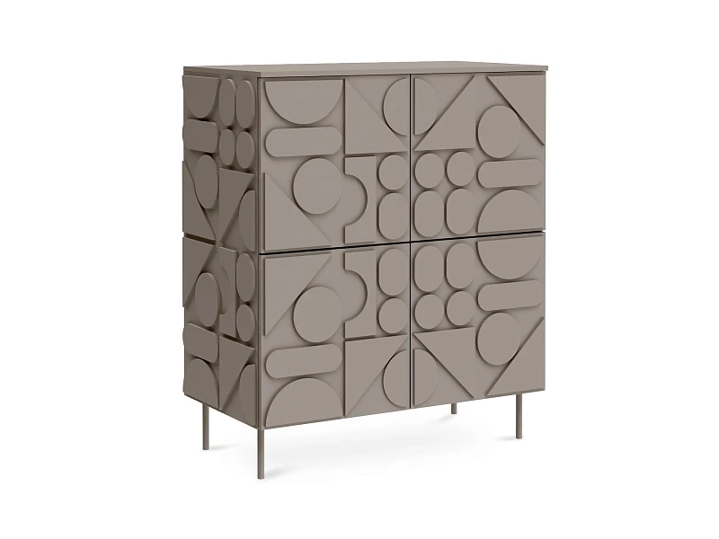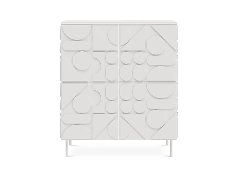 Сервант с четырьмя распашными дверями – две вверху, две внизу. За каждой дверью отделение со съёмной полкой. Перестановка полок по высоте не предусмотрена. Фасады, боковые стенки и крышки изделий коллекции Milton выполнены из МДФ толщиной 16 мм. На фасадах и боковых стенках закреплены детали в виде геометрических фигур из МДФ толщиной 10 мм.