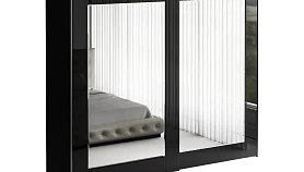 Шкаф-купе с системой плавного закрывания дверей Cinetto PS48 (Италия). Фасад декорирован зеркалами и окрашенным стеклом. Шкаф имеет четыре отделения, в которых установлена штанга под длинную одежду, две штанги под короткую одежду, щитовые полки и выдвижные ящики с функцией плавного закрывания. В крайнее правое отделение шкафа опционально устанавливаются выдвижные элементы: корзины для белья, полки для обуви, держатель для брюк. На каждый из этих элементов можно установить лоток для мелочей. Также возможно установить выдвижной галстукодержатель. В качестве опции предлагаются светодиодные светильники Sirius mini с датчиком движения. Они устанавливаются в любом месте шкафа и работают от батареек. Изделие комплектуется фурнитурой Cinetto (Италия) и Hettich (Германия).