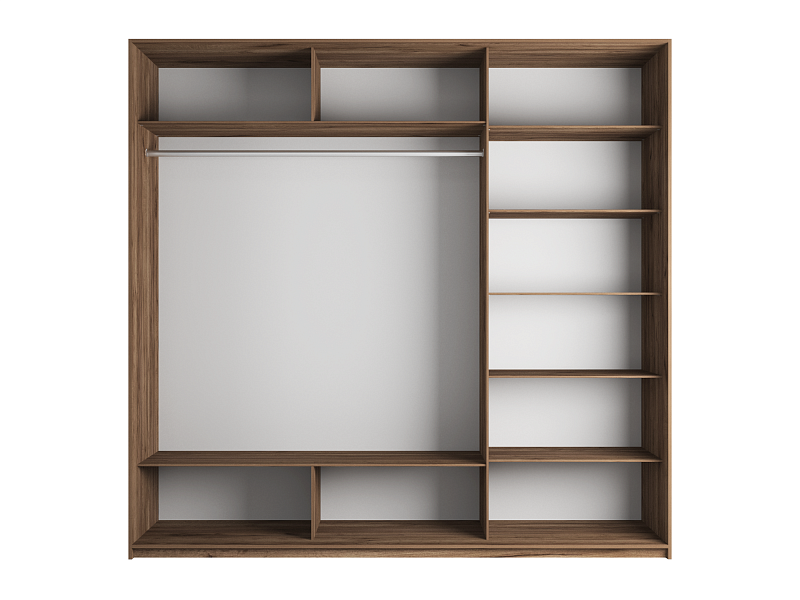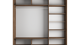 • Внутреннее пространство разделено на 3 части — две части объединены в одну, содержат штангу и по 2 ниши сверху и снизу. Третья часть укомплектована пятью полками;