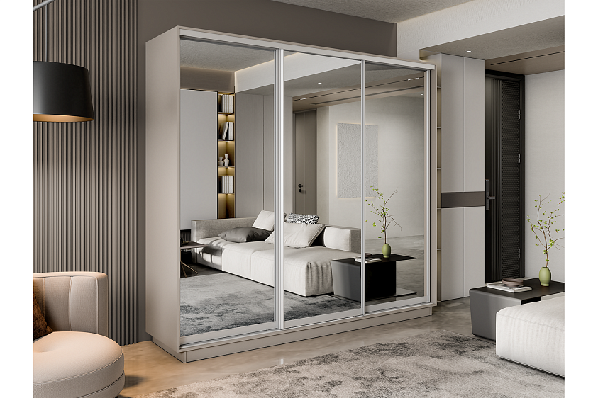 Роликовая система дверей рассчитана на 170 000 тактов «открывание-закрывание». Отдельный цоколь позволяет поставить шкаф вплотную к стене без демонтажа плинтуса. Алюминиевый анодированный профиль надежно защищен от коррозии, а также снижает вес двери и нагрузку на раздвижную систему. Универсальная перегородка внутри шкафа позволяет менять местами секции: можно расположить секцию со штангой или с полками с любой удобной стороны – справа или слева. Безопасные зеркала не осыпаются даже при сильном ударе благодаря противоосколочной пленке. Полкодержатели штифты и "эксцентрик" быстрого монтажа прочно закрепляют полки и не позволяют им переворачиваться при надавливании. Шлегель обеспечивает бесшумное закрывание дверей и защищает внутреннее наполнение шкафа от попадания пыли. Задняя стенка ХДФ изготовлена из плиты высокой прочности, которая не прогнется со временем, а шкаф не деформируется. Ударостойкая кромка ПВХ защищает торцы шкафа от сколов и повреждений. Стальной стопор для дверей устанавливается на нижнем рельсе и обеспечивает мягкую остановку двери и позволяет зафиксировать ее в нужном месте.