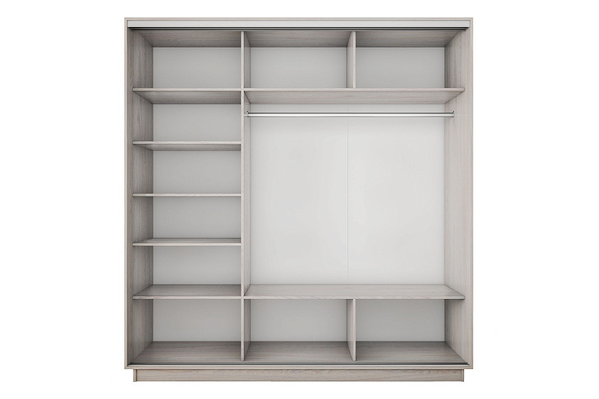 - Внутреннее пространство разделено на 3 части — две части объединены в одну, содержат штангу и по 2 ниши сверху и снизу. Третья часть укомплектована пятью полками;