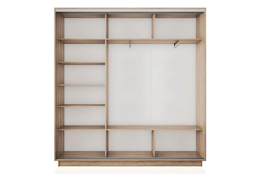 Внутреннее пространство разделено на 3 части — две части объединены в одну, содержат 2 выдвижные штанги и по 2 ниши сверху и снизу. Третья часть укомплектована пятью полками;