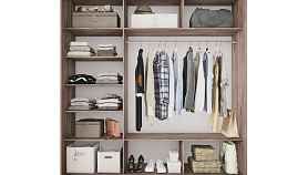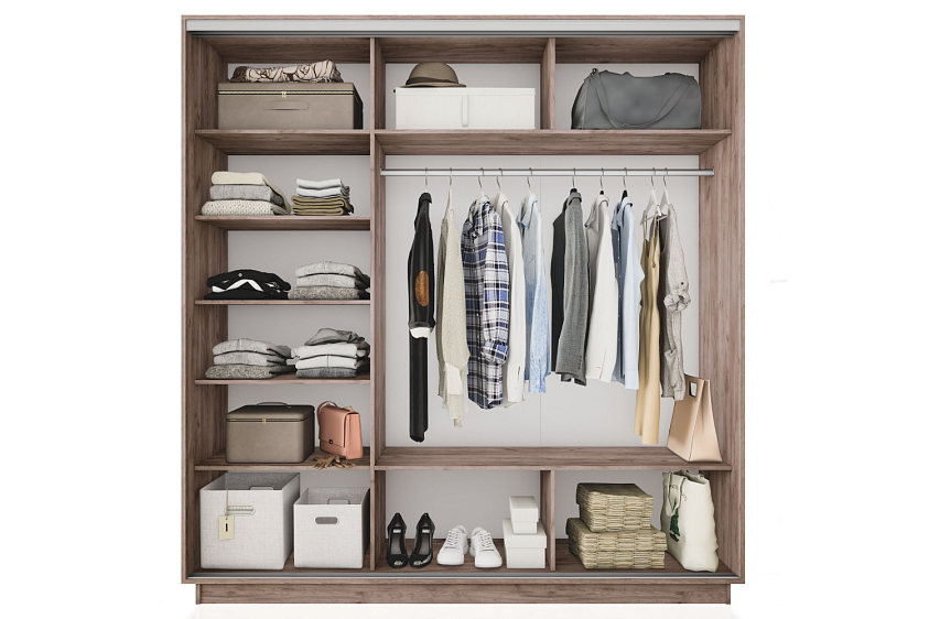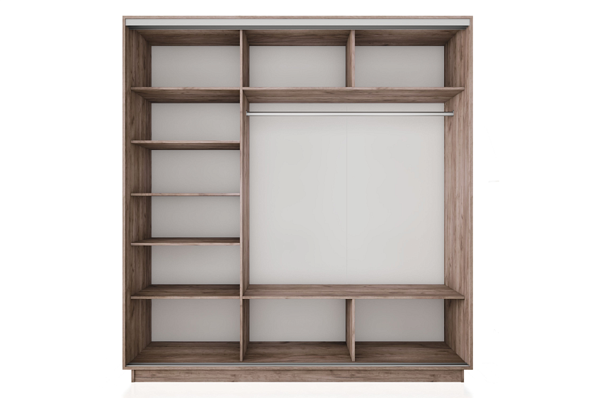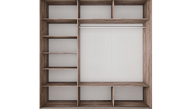 Внутреннее пространство разделено на 3 части — две части объединены в одну, содержат штангу и по 2 ниши сверху и снизу. Третья часть укомплектована пятью полками;