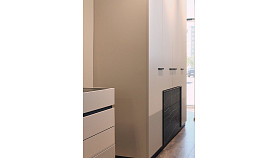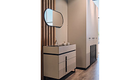 Все модули гармонично сочетаются друг с другом. Черный акцентный мрамор добавляет коллекции изысканности и роскоши, а выразительная геометрия тонких черных ручек на фасадах, перетекающая в линию опор, придают ей современный вид.