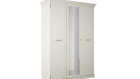 Элегантный трехдверный платяной шкаф станет прекрасным решением для оформления детской, молодежной комнаты, прихожей, спальни, гостиной в стиле кантри или неоклассика. Рамочные фасады украшены горизонтальной фрезеровкой и легкими, изящными линиями фахверков, выдержанные соответствующим образом карниз и цоколь дополняют внешний облик мебели. Матовые поверхности текстурированы под дерево и окрашены в светлый оттенок «валенсия». Строгую симметрию изделия подчеркивает центральная зеркальная вставка. Завершающим штрихом служит фурнитура с покрытием под «сатиновое золото».