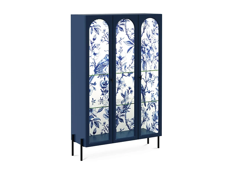 Витрина с тремя фасадами, из них два крайних – распашные, центральный – стационарный – не открывается. Рамка фасадов выполнена в виде арки. Количество полок – 2 шт.