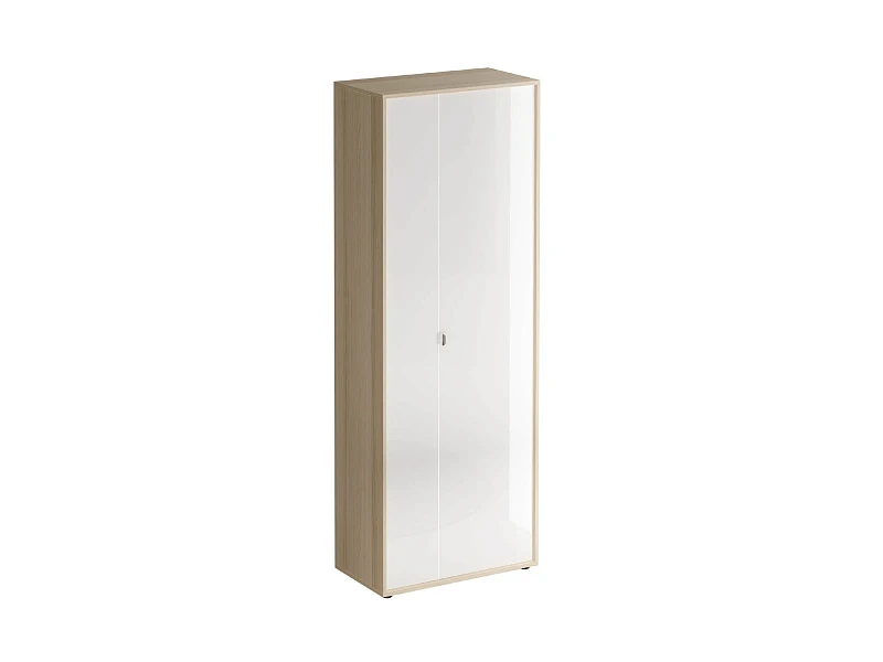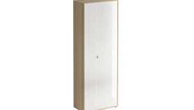 Шкаф двухстворчатый.|Наполнение шкафа: выдвижная штанга для одежды и две полки. Узкая дверь декорирована окрашенным стеклом, на широкую дверь – наклеено зеркало.|Двери можно менять местами.|Шкаф крепится к стене.