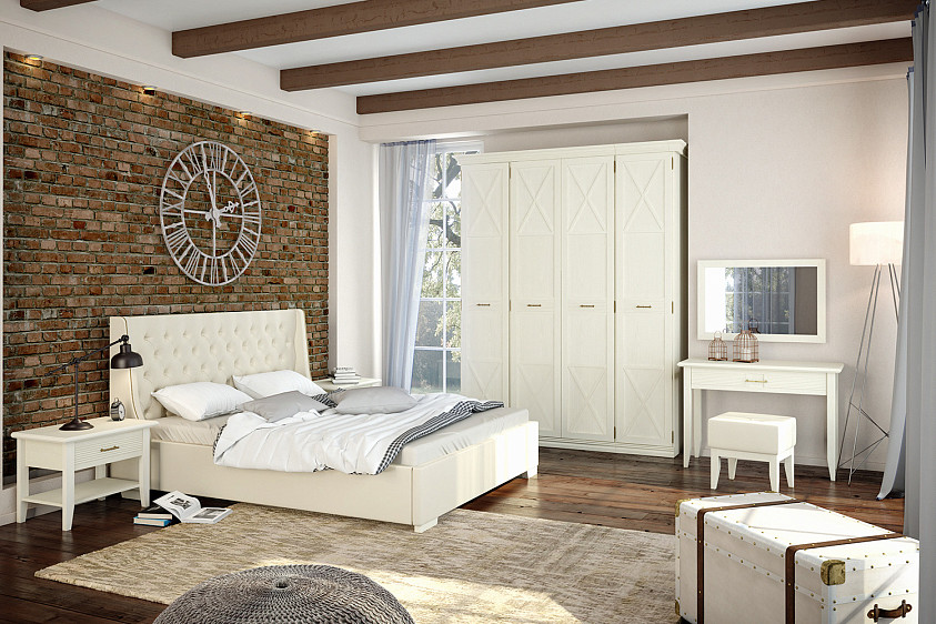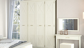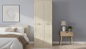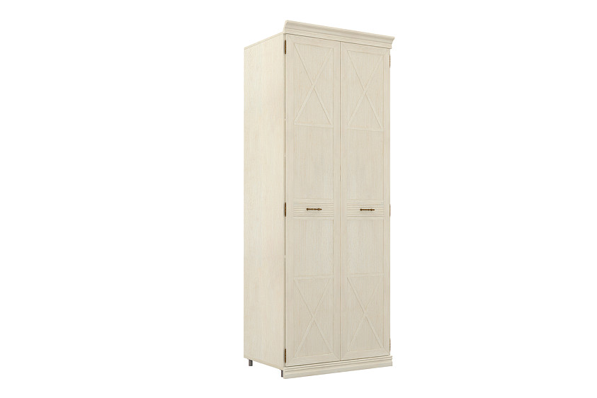 Изделие представляет собой современное прочтение классического дизайна. Шкаф имеет традиционную рамочную конструкцию, глухие фасады декорированы стильными элементами фахверками. Композицию органично дополняют вставки со сложной фрезеровкой и элегантная фурнитура в виде ручек-скоб в оттенке «античная бронза». Металлические опоры позволяют регулировать высоту мебели соответственно неровностям напольного покрытия. Цоколь из МДФ-профиля изящно скрывает прочные ножки.