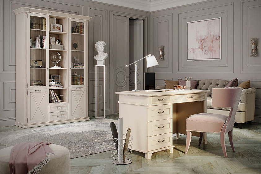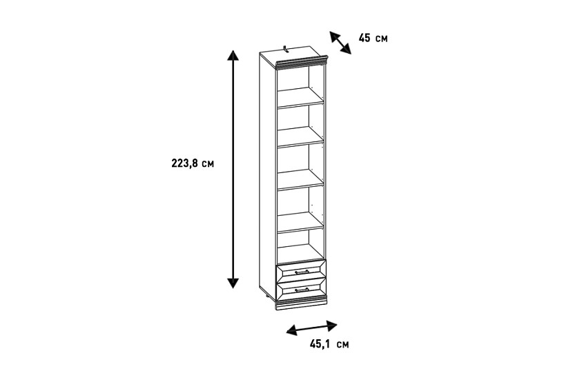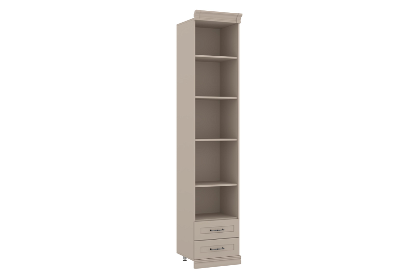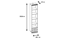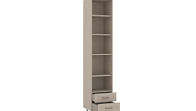 - Верхнее отделение — открытое (без фасада) с тремя съемными полками ЛДСП, в нижнем отделении — два выдвижных ящика;