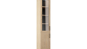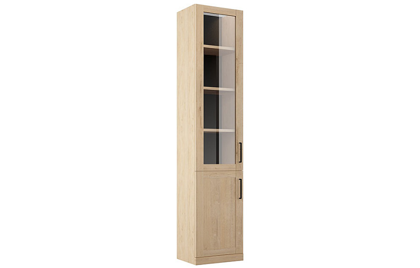 Корпус изготовлен из ламинированной ДСП и экологичной древесной плиты. Фасады декорированы лаконичными филенками, ручками-скобами в контрастном цвете «античное железо». Верхняя часть украшена прозрачной стеклянной вставкой. Дверцы могут быть навешаны как на левую, так и на правую сторону. Модель используется преимущественно для хранения книг, сувенирной продукции, коллекционных предметов. Предельно допустимая нагрузка на полку составляет 6 кг. Цельная конструкция крепится к стене во избежание падения.