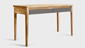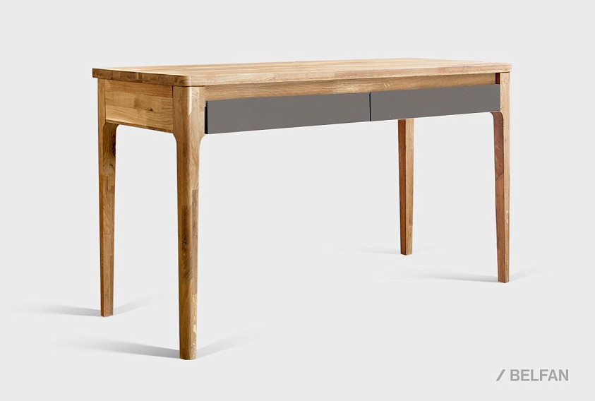 ? Стол изготовлен из комбинации материалов - массива дуба и эмали. Из массива дуба изготовлены ноги, столешница, корпус ящиков, фасады в цвете "бейц-масло".