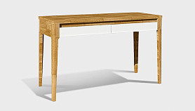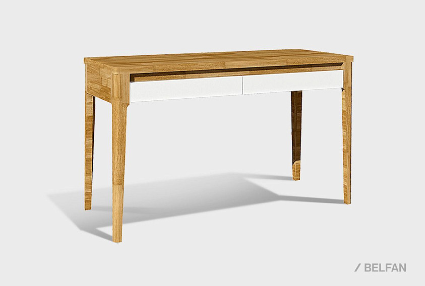 ? Стол изготовлен из комбинации материалов - массива дуба и эмали. Из массива дуба изготовлены ноги, столешница, корпус ящиков, фасады в цвете "бейц-масло".