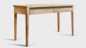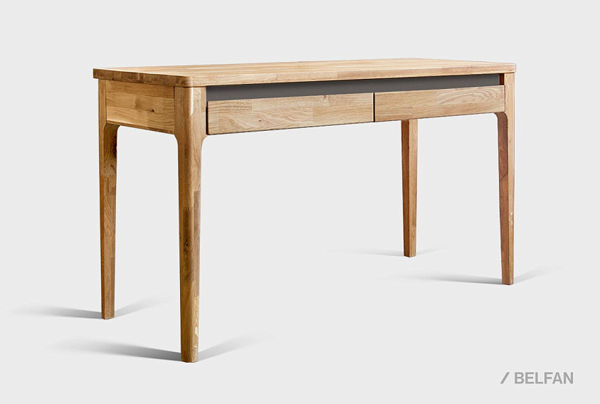? Стол изготовлен из комбинации материалов - массива дуба и эмали. Из массива дуба изготовлены ноги, столешница, корпус ящиков, фасады в цвете "бейц-масло".