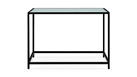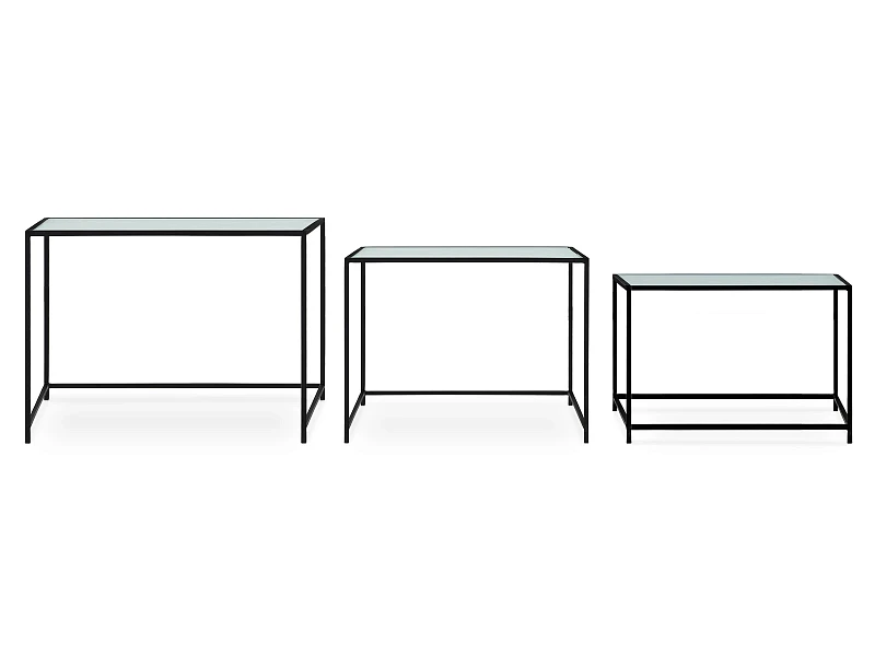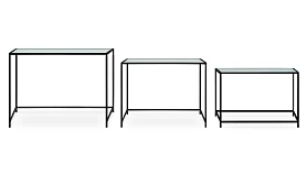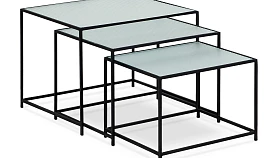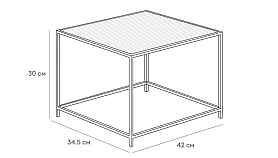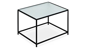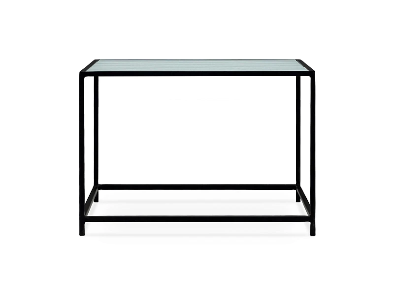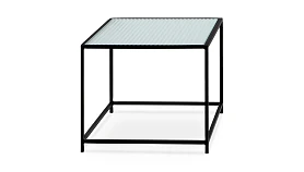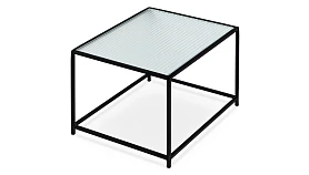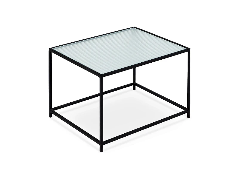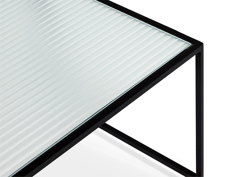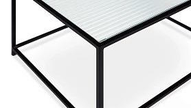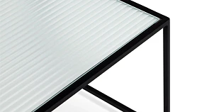 Каркас металлический с черным матовым покрытием. Стеклянная столешница выполнена из прозрачного рифленого стекла. Столешница укладывается сверху на резиновые демпферы, расположенные в углах каркаса.
