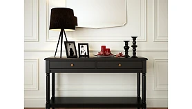 Коллекция Music — респектабельная мебель с классической основой. Обладает притягательной энергетикой изящных форм, поэтичного черного цвета и безупречным исполнением. Комоды, тумбы, банкетки, консольные и журнальные столики подходят для оформления гостиной, спальни, прихожей, мастерской, студии, бьюти-зоны. Идеально вписывается в стилистику неоклассики, арт-деко, минимализма, эклектики. Лейтмотив коллекции — барочные элементы: фигурные ножки из массива дерева, каретная стяжка «капитоне», акцентные детали в бронзовом и золотистом цвете. Изделия подчеркнут в интерьере смелость, выразительность, спокойствие. Они надежно сохранят ваши секреты, помогут разложить вещи по местам и поддержат настроение «тихой роскоши». Могут выступать на контрасте с главенствующим светлым оттенком или быть частью ненавязчивого темного фона.