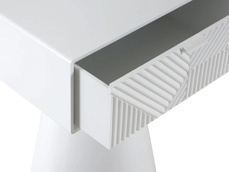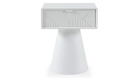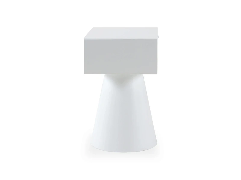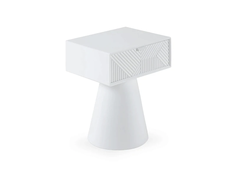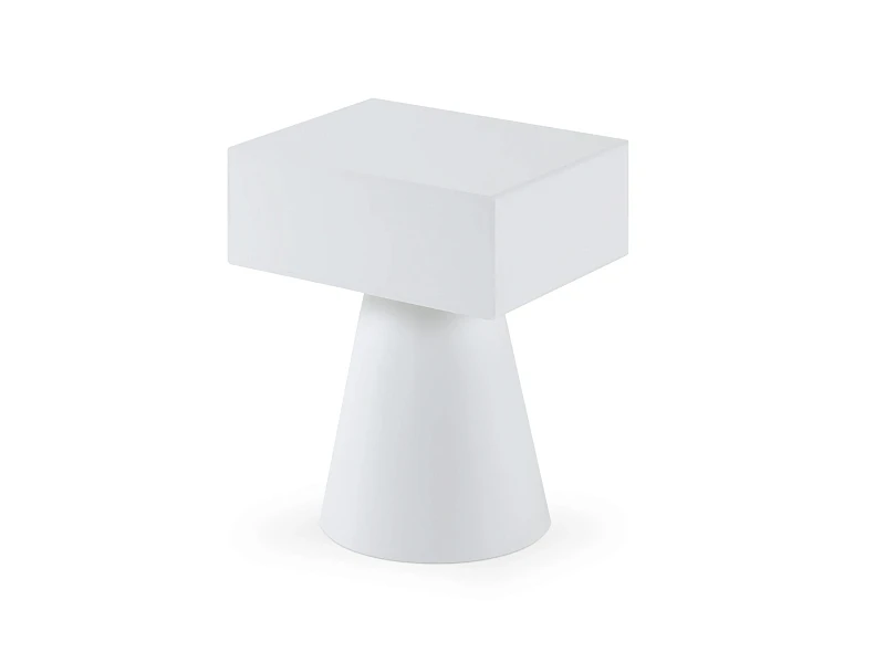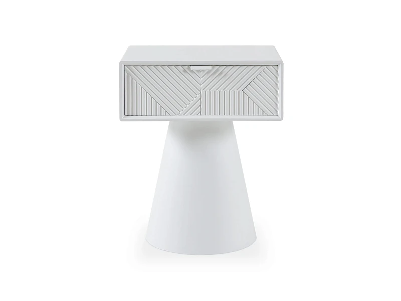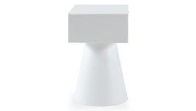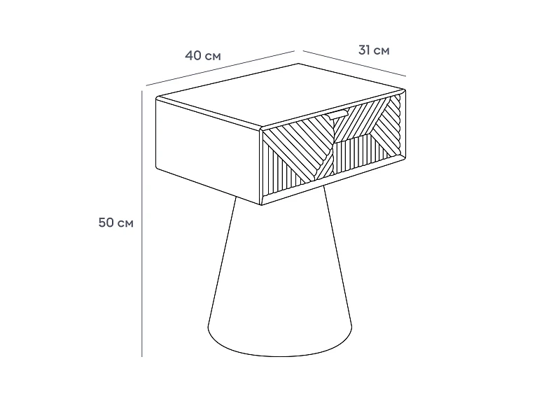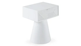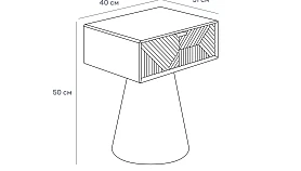 Тумба прикроватная Parex отличается художественной эстетикой. Фишка — игра геометрии. Прямоугольная столешница с вкладным ящиком изящно балансирует на верхушке конуса. Можно использовать как необычную прикроватную тумбу, элегантный приставной столик в гостиной, вместо консоли, полочки для мелочей в прихожей.