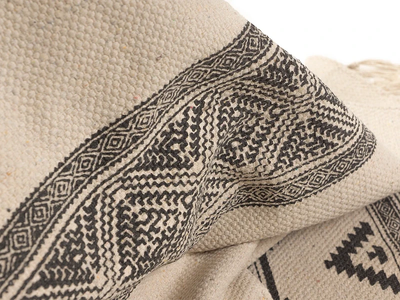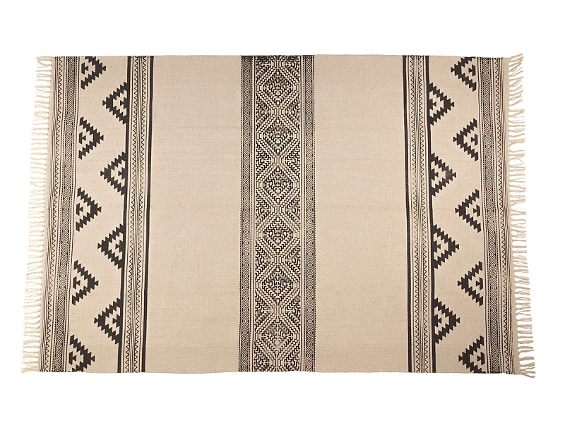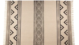 Пригоден как для домашних локаций, так и для зон с высокой проходимостью, например, для прихожей, коридора, лобби, лаундж-зоны. Привлекательный дизайн модели обеспечивают трендовые спокойные оттенки, акцентные элементы — геометрические узоры, бахрома, фактурная выразительность материала.