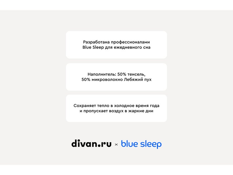 Высокопрочное и долговечное эвкалиптовое волокно (тенсел), из которого произведено наше одеяло, хорошо впитывает влагу и пропускает воздух, создавая идеальные условия для качественного комфортного сна. Наполнитель из такого волокна в сочетании с «Лебяжьим пухом» очень пышный и мягкий, к нему приятно прикасаться. Чехол одеяла изготовлен из ткани, состоящей из микса тенселя и хлопка, поэтому поверхность изделий нежная и гладкая. Также благодаря хорошему влагопоглощению обеспечивается среда, подавляющая образование и размножение бактерий.